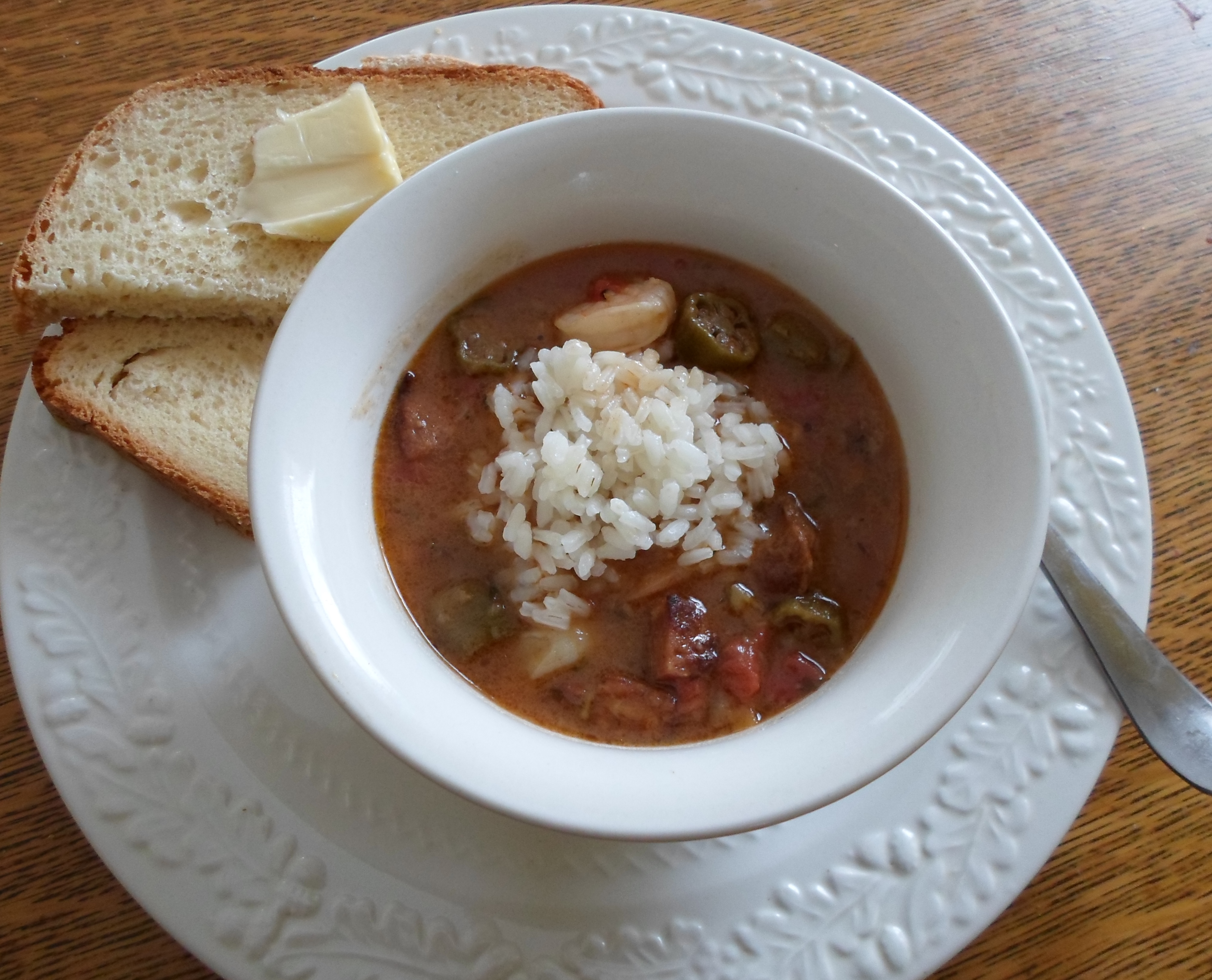 I love gumbo. It is as much fun to make as it is to eat. I think I am hearing a loud chorus of groans here, from my southern friends who are saying, “There is NO WAY a Farm Woman from Minnesota can make a real gumbo!” as well as my northern Minnesota Scandinavian friends whining, “Okra? Ewwwwwww!” or by HIM, who will just say “Why can’t we just have hamburgers like everybody else?” Y’all be quiet just a minute, because you might just get a little history here, too. Gumbo is simply a country stew, made from the fresh local ingredients that many Louisiana Farm Women had at the time. No sausage? Use bacon or ham. No chicken? Use ‘gator. It tastes like chicken, anyway. Did you know that the word ‘gumbo’ comes from African word for okra? I also learned while researching for this article that there are several types of gumbo, depending on the thickener, and that gumbo aficionados think that meat and seafood should not be mixed in a traditional gumbo. Well, I have always been a little bit of a rule breaker. Just ask my mother. My gumbo is good, despite breaking the rules. Here in Minnesota, it is hard to find fresh okra, so I often use frozen or canned, and it is just fine and not a bit slimy, all you groaners. You can also grow okra in your garden, but it is one of those vegetables that needs a long hot summer, and we Zone 3 gardeners can’t always count on that. I also use a Minnesota-grown sunflower oil (http://www.smudeoil.com/), which adds a nutty flavor to the dish. Before you try the recipe, you must know that although is isn’t hard, you must be a patient roux maker. Gumbo is only as good as the roux, or foundation of the dish.