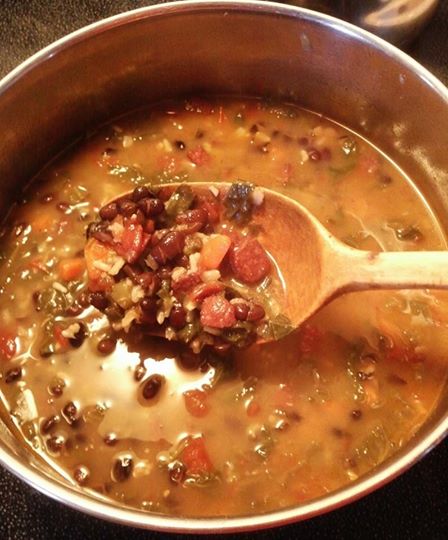 I promised myself that I would not write about the weather or the cold temperatures this week. What I will do is offer you a spicy soup recipe that is sure to warm you right down to your toenails. It’s also fairly inexpensive to make, so that should help you when it comes time to pay your propane or electric bill. Since I can’t be outside in the garden, I often spend Sunday afternoons experimenting with recipes using what I have on hand. HE prefers plain country cooking and eats neither rice, beans, nor kale, so I’m sure he was relieved when I told him this soup was just for me…and for you.